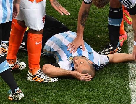 马切拉诺在与维纳尔杜姆的碰撞之后倒地 在与荷兰队的半决赛中,马斯切拉诺在一次激烈的拼抢中一度到底至昏厥,尽管他在接受过一系列治疗之后重新回到场上继续比赛,但中这名阿根廷防守型中场能否在决赛中有优秀的表现仍然存在着疑问。萨维利亚在赛后接受采访中曾一度表示马斯切拉诺是这一届阿根廷队的一个标志性人物,他在比赛第90分钟成功封堵了罗本突破后的射门。 然而,决赛将在半决赛后的第五天开打,马斯切拉诺也有足够的时间去恢复。阿根廷人会像支持他们的梅西一样去支持马斯切拉诺。 五、如果德国先取得进球 在本届世界杯中,凡是德国先取得进球的比赛中,德国人都取得了胜利。并且,在与葡萄牙、法国以及巴西的比赛中,德国在比赛开始的15分钟内就取得了进球。 除了比利时意外,阿根廷也被认为是本届杯赛较为慢热的一支球队,在与瑞士队的比赛中,阿根廷人也就在最后时刻由迪玛利亚攻入一粒致胜球。所以,萨维利亚的球队需要将所有精力都击中在阻击德国人率先取得进球的策略上。 六、如果迪玛利亚可以上场 迪玛利亚可能不会希望以“在打入制胜球之前曾经51次丢球”而被人们记住,这名皇马的边锋在上个赛季的所有俱乐部比赛中总共贡献了26次助攻。尽管阿根廷队里可以代替迪玛利亚上场的有拉维奇以及佩雷斯,但如果迪玛利亚能在决赛中复出队萨维利亚来说绝对是一件利好的事。 在德国与阿尔及利亚的比赛中,赛后有评论指出德国人在防守反击方面仍然有着很大的提升空间,而对于擅长打防守反击的皇马来说,迪玛利亚如果能上场比赛那么对于在比赛最后阶段阿根廷的防守反击将会对德国队的球门造成很大的威胁。