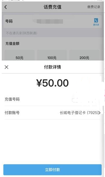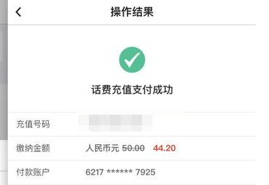 ' u5 @1 }5 f6 G0 G支付前不显示优惠金额 支付后会显示 亲测44.2元充值50元话费 等于优惠了5.8元6 x m3 H I1 H# r; S2 N9 X